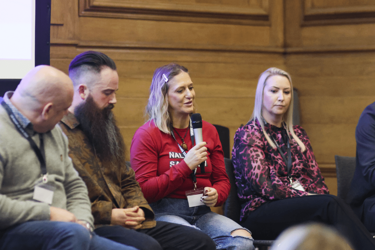 Woman in red talk holds microphone sat next to 3 other speakers. Everyone has thoughtful expression as they listen to the women with red jumper speak.